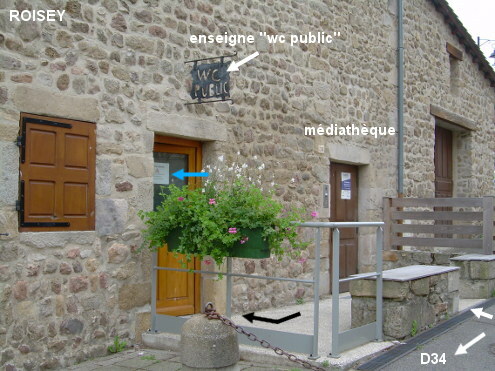Ces toilettes se trouvent dans un grand bâtiment qui comporte la médiathèque et situé à gauche de l'église érigée au bord de la D34. En provenance du lieu-dit La Garde sur la D34, juste après l'église érigée côté droit, entrer sur le parvis piéton qui s'étend à gauche de l'église. Se diriger vers le bâtiment à gauche, passer à côté de la chaîne tendue entre deux bornes (empêchant les véhicules venant du parking derrière de prendre un raccourci pour rejoindre la D34) puis par le passage entre les barrières de protection autour de la porte de la médiathèque (au n°38) et de celle des toilettes à sa gauche. La porte des toilettes est identifiée par une enseigne noire en ferronnerie accrochée au-dessus, perpendiculaire à la façade. N.B. : En plus du lavabo, il y a plus bas à sa droite un robinet-papillon.
