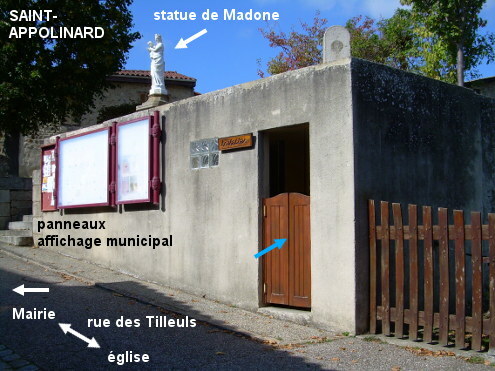 Les toilettes se trouvent presque en face de la Mairie et non loin de l'église, dans le centre du bourg qui est traversé par une rue dont les deux extrémités rejoignent la D503. 1) En provenance de Saint-Julien-Molin-Molette sur la D503, un moment après le panneau de début de village, peu après un arrêt de bus et le panneau ''zone 30'' tourner à droite. Rouler tout droit jusqu'à la Mairie sise côté doit. On verra alors quelques mètres après côté gauche dans le mur de soutènement d'un square avec une statue de Madone perchée, les deux demi battants de porte sur ressorts donnant dans les toilettes (à 110 mètres de la D503). N.B. : Il est impossible de rentrer à l'intérieur des toilettes avec son vélo (il viendrait buter contre le pan de mur isolant les urinoirs) mais le lavabo se trouve tout de suite à droite dans le coin. 2) En provenance de Maclas sur la D503 et après le lieu-dit Choron, en arrivant vers le point kilométrique 10 on verra le cimetière implanté côté gauche derrière le carrefour avec une rue adjacente (il n'y a qu'une flèche ''la croix verte'', et rien n'indique que cette rue mène au bourg si ce n'est l'église que l'on aperçoit au loin). Tourner à gauche dans cette rue, on ne verra aucun panneau de début de village, rouler tout droit (au carrefour avec une rue adjacente à gauche, suivre le virage à droite). Quelques mètres après avoir dépassé l'église érigée côté droit, on découvrira l'entrée des toilettes (à 480 mètres de la D503) côté droit dans le mur de soutènement du square en surplomb au-dessus duquel s'élève une statue de Madone sur piédestal.