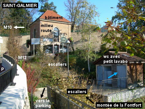 Ces toilettes se trouvent en bordure du bois de la Fontfort situé à la périphérie sud de la ville au bord de la M12 en direction de Veauche, non loin du rond-point avec la M10. N.B. : L'unique lavabo, dans la cabine WC à droite, est trop petit pour remplir un bidon directement. En provenance de Chevrières sur la D6, au carrefour en T avec la M12 (nouvelle appellation de la D12), tourner à gauche. Peu après on voit déjà le début du bois de la Fontfort côté gauche. Continuer jusqu'au carrefour à l'entrée duquel il y a un grand bâtiment carré (Office de Tourisme économique) dans la fourche et traverser vers la gauche sur le passage piéton. On aperçoit alors en contrebas le petit bâtiment en bois des toilettes. Le plus simple est de contourner les escaliers (12 marches, un palier, et encore 11 marches) en passant par le parking à droite pour emprunter le plan incliné. P.S.1 : Pour repartir en direction de Rivas, continuer tout droit jusqu'au rond-point et prendre la dernière sortie, suite de la M12 en direction de Veauche, au rond-point suivant tout droit, aux feux tout droit, puis au rond-point d'après tourner à droite dans la D101 (M101) direction Rivas. PS.2 : Si on veut aller à Bellegarde-en-Forez, au premier rond-point tourner à droite, c'est la M10 et la direction Bellegarde-en-Forez est indiquée.