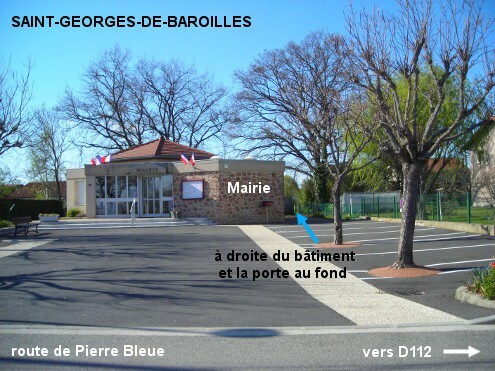 A partir de la D112 en provenance de Nervieux et juste avant de rejoindre la D38 sur un carrefour en Y, prendre la rue à gauche (route de Pierre Bleue), la Mairie avec un grand parking devant est visible depuis la D112. Les toilettes sont dans le même bâtiment que la Mairie, sur le côté droit vers le fond. Il y a aussi en extérieur au début du pignon droit un robinet d'eau disponible.