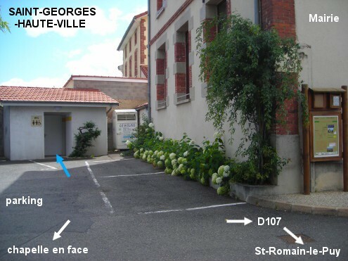 Le petit bâtiment des toilettes est implanté sur un parking derrière la Mairie et n'est pas visible depuis la route, il est également à proximité de l'église. Sur la D107 en direction de Saint-Romain-le Puy, environ 70 mètres après l'intersection avec la D109, tourner à droite derrière la Mairie et avant l'église. On entre dans un parking au fond duquel est implanté le Monument aux Morts, le bâtiment des toilettes est sur la droite, presque contre la Mairie. N.B.: Dans les lavabos, l'écoulement de l'eau est déclenché par une cellule à détection.