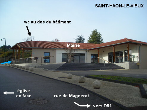 Les toilettes se trouvent sur l'arrière du bâtiment de la Mairie située à côté de l'église. Sur la D81 en provenance de Saint-Germain-Lespinasse, au centre du village tourner à gauche en direction de la Mairie puis aussitôt à droite avant l'église. Monter dans la rue jusqu'à l'arrière du bâtiment de la Mairie implantée côté droit. La porte des toilettes se trouve juste derrière l'angle (à 100 mètres de la D81), à côté d'une unique place de stationnement, pour handicapés, située entre le bâtiment et un mur. N.B. : En plus du lavabo dans l'entrée des toilettes, il y a un robinet à droite de celui-ci.