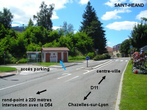 Le petit bâtiment de ces toilettes est implanté à l'entrée d'un immense parking côté gauche au bord de la D11 en provenance de Chazelles-sur-Lyon (presque en face du n° 29 bd Ravel de Malval), 220 mètres après le rond-point à l'intersection avec la D54.