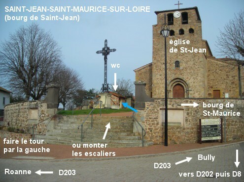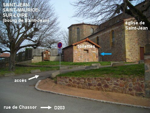 Ces toilettes sont situées à côté de l'église du bourg de Saint-Jean, la commune étant issue de la fusion de deux villages (Saint-Jean et Saint-Maurice-sur-Loire), et à proximité de la Mairie. En provenance de Lentigny, sur la D203, on arrive du côté du bourg de Saint-Jean puis sur un carrefour en T avec sur la droite la rue qui rejoint la D202 puis la D8, et sur la gauche la suite de la D203. L'église de Saint-Jean est implantée à gauche de ce carrefour, au fond d'un espace piéton en surplomb. Soit monter les escaliers pour trouver à gauche de l'église le bâtiment en pierre des toilettes, soit tourner à gauche avant l'église dans la rue de Chassor pour prendre aussitôt à droite l'allée qui monte vers les toilettes (en haut de l'allée, côté gauche).