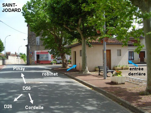 Le petit bâtiment qui abrite les toilettes est implanté au bord d'une grande place (sur laquelle il y a le Monument aux Morts) le long de la D56, presque en face de l'intersection avec la D26. Sur la D56 en direction de Pinay, juste après l'intersection à gauche avec la D26 direction Neulise, il y a sur le bord droit, à l'angle avec la rue des Communes, le petit bâtiment qui comporte un abribus et des toilettes (face au n° 180 route du Forez). L'entrée des toilettes se fait par l'arrière, côté parking (N.B.: Placer les mains sous l'orifice du robinet pour déclencher la cellule qui commande l'écoulement de l'eau dans le lavabo). Sur la façade côté trottoir et route, il y a un robinet supplémentaire.