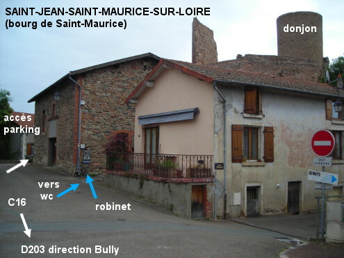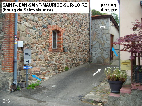 Ces toilettes se trouvent dans l'ancien bourg de Saint-Maurice à proximité du donjon juste avant la zone piétonne. A partir de la D203 en provenance de Bully, peu après le début de la commune de Saint-Jean-Saint-Maurice-sur-Loire (issue de la fusion des villages de Saint-Jean-le-Puy et Saint-Maurice-sur-Loire), tourner à droite dans la voie C16 en direction du ''bourg de Saint-Maurice'' (rue du Port de la Caille). Continuer sur environ 230 mètres jusqu'à voir sur la droite deux flèches indiquant les WC. 1) La première flèche est au-dessus d'un robinet d'eau potable (accompagné d'un écriteau explicite) qui est concerné par une coupure d'eau hivernale, implanté à l'angle avec le passage piétonnier desservant les toilettes situées sur son côté gauche. 2) La deuxième flèche un peu plus loin est à l'entrée du parking sis Forum de la Tour au fond duquel sur la droite on peut aussi accéder aux toilettes situées sur la droite dans la courte allée entre le parking et la rue du Port de la Caille. N.B. : Le lavabo est relativement petit. P.S. : Si l'on continue dans la route du Port de la Caille (suite de la rue du même nom, qui oblique à gauche), au début de laquelle une vieille plaque Michelin indique la direction de Roanne, on débouche plus loin sur la D203, dans la direction de Lentigny.