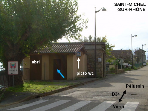 Les toilettes se trouvent à proximité de l'église érigée au bord de la D34, dans la fourche du carrefour situé à droite de l'église. 1) En provenance de Chavanay sur la D90 puis la D34, peu avant l'église que l'on aperçoit au loin côté droit, s'arrêter à hauteur du petit bâtiment côté droit sur lequel il y a une pancarte perpendiculaire avec le pictogramme des toilettes, qui est dans l'angle du carrefour situé juste avant l'église. L'entrée des toilettes est située en regard de l'église. 2) Sur la D34 en provenance de Vérin (à partir du bourg et de sa rue principale ''rue Jean Vincent'', rouer en direction opposée à la D30 puis après le pont sur la rivière prendre à droite la ''rue de la Voie Romaine'' qui est en face décalée sur la droite, pour déboucher plus loin sur la D34, monter alors à droite), juste après l'église érigée côté gauche on verra le petit bâtiment des toilettes derrière un arbre dans la fourche du carrefour en Y avec la place des Mûriers.