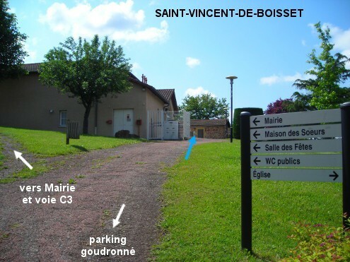 Le bâtiment des toilettes est situé à proximité de la Mairie (suivre les flèches "Mairie" et "WC public"). A partir de la rue principale qui traverse le village, à côté de la Mairie tourner dans l'allée perpendiculaire qui donne accès à un parking goudronné (il y a un deuxième parking en terre battue plus éloigné de la Mairie), quitter le macadam à gauche pour se diriger à la perpendiculaire sur le chemin : le bâtiment des toilettes est en face tout au fond, à gauche de l'espace gazonné et de l'aire de jeux (on aperçoit l'église au loin sur la droite). Attention : fermeture nocturne de ces toilettes automatiques très récentes. N.B. : La rue principale est la route sur laquelle on se trouve en prenant la direction de St-Vincent à partir de la D27, elle porte le nom de route de la Mairie dans sa partie la plus proche du Coteau (la façade de la Mairie n'est bien visible qu'en direction du Coteau, sur le côté gauche).