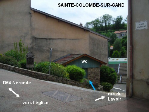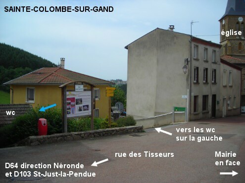 Les toilettes sont situées non loin de la Mairie, à 130 mètres de la D64. Sur la D64 en provenance de Néronde (qui se superpose ici à la D103 en provenance de Saint-Just-la-Pendue), en face d'une grande croix côté droit tourner à gauche en direction de la Mairie dans la rue qui descend (rue des Tisseurs) et dans l'axe de laquelle on aperçoit l'église. Puis en face du parking devant la Mairie côté droit, tourner à gauche pour trouver le bâtiment des toilettes côté gauche au tout début de cette rue en descente (rue du Lavoir). N.B. : Dans l'entrée des toilettes, il y a un grand évier rectangulaire où il est possible de remplir même les très grands bidons.