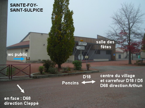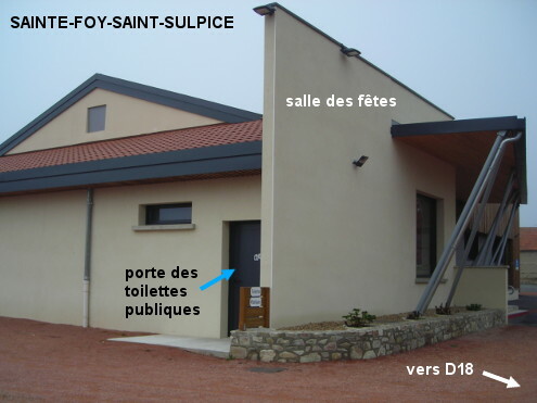 Les toilettes se trouvent dans le même bâtiment que la salle des fêtes située presque en face du carrefour de la D68 en provenance de Cleppé avec la D18 direction Poncins. 1) En venant de Cleppé, à ce carrefour on verra la salle des fêtes en face légèrement décalée à droite. Entrer sur l'esplanade en terre battue et se diriger vers le côté gauche du bâtiment pour trouver à 30 mètres la porte des toilettes. N.B. : Les toilettes sont très récentes mais le lavabo est relativement petit. 2) En provenance d'Arthun par la D68, de Saint-Germain-Laval par la D18 ou de la D5, au carrefour au centre du village proche de l'église, prendre la direction de Cleppé pour trouver 120 mètres plus loin côté droit la flèche indiquant l'accès aux toilettes sur le pignon gauche de la salle des fêtes (le plus éloigné quand on circule dans ce sens).
