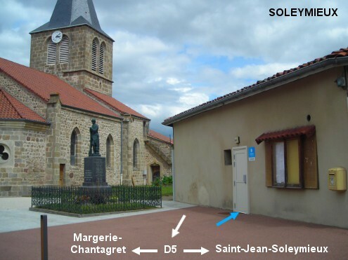 Les toilettes sont situées à côté de l'église. Sur la D5 en provenance de Saint-Jean-Soleymieux, juste après avoir passé sur la gauche et dans le virage à gauche la place de la Fontaine (attention: eau non potable!) au bord de laquelle est implantée la Mairie, on verra l'église à droite. La porte des toilettes est située dans le bâtiment qui est à droite de l'église et du Monument aux Morts (elle est en face du n° 25 route de la Plaine).