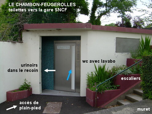 Ces toilettes se trouvent à proximité de la gare SNCF, près de grands panneaux de signalisation. Il s'agit d'une cabine WC autonettoyante (les urinoirs sont dans un recoin juste avant) incluse dans un mur, dotée d'un lavabo-boite tri-fonction (ici l'eau est à l'extrémité droite) muni d'une cellule à détection pour la commande de l'écoulement de l'eau. 1) Au sortir de la gare SNCF, se diriger vers la droite pour trouver dans la fourche du carrefour les toilettes incluses dans le mur. On peut accéder à celles-ci de plain-pied en passant par la gauche pour contourner le muret qui sépare le grand espace sur le trottoir de l'allée en contrebas desservant les toilettes (l'autre accès se fait par des escaliers descendant depuis la D10 à droite qui monte). 2) En provenance de Jonzieux puis du lieu-dit Malmont sur la D10, rouler toujours tout droit. On franchit un pont enjambant la N88 puis un autre rond-point tout droit. Ensuite la rue vire à gauche en descendant pour arriver sur le côté de la gare SNCF. Avant la gare, entrer à droite sur l'espace piétonnier sur le trottoir et contourner le muret par la gauche pour accéder aux toilettes. 3) En provenance de Roche-la-Molière sur la D10, au stop après le pont sur l'Ondaine continuer tout droit en direction de la gare et du lieu-dit Malmont, aux feux aussi. On arrive ensuite face à la gare, tourner à gauche puis juste après la gare au carrefour avec une rue en sens unique en face (tandis que la rue sur laquelle on roule vire à droite avant de virer à gauche en montant), monter sur le trottoir au début de cette rue en face pour accéder aux toilettes. P.S. : Ces toilettes ont été rénovées après le mois de mai 2023.