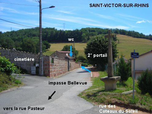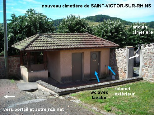 Les toilettes se trouvent à l'intérieur du cimetière qui est situé dans une impasse sur les hauteurs du village. 1) A partir de la D9 en provenance de Régny, après avoir passé la Mairie côté gauche, tourner à gauche dans la rue Marmanton (en direction de l'église) et grimper. Continuer tout droit dans la rue des écoles lorsque la suite de la rue Marmanton sur la gauche est en sens interdit. A proximité de l'église érigée sur une place à gauche, prendre la branche droite du T (à droite de l'obélisque) pour déboucher au sommet sur la rue Pasteur. Poursuivre sur la droite, puis longtemps après deux carrefours à gauche (700 mètres après la D9), tourner à gauche dans l'impasse Bellevue pour trouver 100 mètres plus loin le cimetière implanté côté gauche et après un carrefour en Y. Le cimetière est composé de deux parties : ancien cimetière (dont les allées sont asphaltées) puis nouveau cimetière (allées en terre battue). Les toilettes et les robinets se trouvent dans la partie nouvelle, celle de droite, accessible par le deuxième portail (ou par le premier et un passage à droite reliant les deux parties). Si l'on entre par le deuxième portail, on trouvera un premier robinet immédiatement à gauche du portail, puis un deuxième robinet sur le mur extérieur du bâtiment des toilettes qui est dans le coin avant gauche contre le mur mitoyen avec la partie ancien cimetière, à côté du passage reliant les deux cimetières. On trouvera aussi à l'intérieur des toilettes (porte de droite) un lavabo dans lequel il est possible de remplir de grands bidons. N.B. : Si l'on retourne au début de l'impasse et que l'on prend la suite de la rue Pasteur, on arrivera 460 mètres plus loin au niveau du lieu-dit La Tronchée vers la D9 légèrement décalée sur la droite (si l'on fait un droite/gauche, on sera en direction d'Amplepuis). 2) Si c'est par ce côté que l'on arrive au village, peu après le panneau de début, quitter la D9 à droite pour la rue Pasteur presque parallèle puis prendre la deuxième à droite (en épingle) : c'est l'impasse Bellevue. N.B. : Pour la suite du parcours, on peut continuer rue Pasteur jusqu'à voir sur la gauche la rue Marmanton (après deux rues en sens interdit) qui débouche ensuite en bas sur la D9.