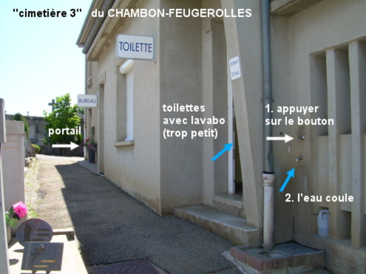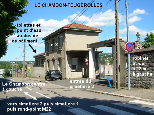 Le cimetière est situé à proximité de la M22 direction Saint-Romain-les-Atheux. Il est composé de cinq parties dont trois donnant sur la rue et ayant chacune un robinet. Les toilettes se trouvent dans la partie nommée ''cimetière 3'' qui est la plus à gauche et porte le n°3 dans la rue. N.B. : Les horaires d'ouverture sont de 7h30 à 20h du 01 mai au 31 octobre et de 7h30 à 18h en hiver du 01 novembre au 30 avril. 1) En provenance de Roche-la-Molière sur la D10, au stop après le pont sur l'Ondaine continuer tout droit en direction de la gare et du lieu-dit Malmont, aux feux aussi. On arrive ensuite face à la gare, tourner à gauche puis suivre la route (branche droite d'un carrefour en Y) en direction de Saint-Romain-les-Atheux qui passe au-dessus de la RN88. Au premier rond-point prendre la deuxième sortie et emprunter la bande cyclable, puis au deuxième rond-point prendre aussi la deuxième sortie toujours en direction de St-Romain-les-Atheux. On longera ainsi la RN88. Juste après la première rue adjacente à droite et juste avant le carrefour en croix, prendre la file de droite pour tourner à droite en direction de St-Romain-les-Atheux (M22). Ensuite, au rond-point tourner à gauche (troisième sortie, ''Le Chambon centre''). Le cimetière est implanté un peu plus loin côté droit. 1a) Si l'on entre par le premier portail, on sera dans le ''premier cimetière'' et on trouvera le premier robinet à gauche. 1b) Si l'on entre par le deuxième portail, on sera dans le ''cimetière 2'' et on trouvera le deuxième robinet à gauche également. 1c) Si l'on entre par le troisième portail ou son portillon (à 220 mètres de la M22), on sera dans le ''cimetière 3'' et en marchant 22 mètres sur la gauche (allée asphaltée) le long du grand bâtiment, on trouvera l'entrée des toilettes accompagnée d'un écriteau. N.B. : Le lavabo à l'intérieur est trop petit mais il y a un point d'eau à l'extérieur dans le recoin à droite de l'entrée des toilettes (n'appuyer qu'un coup sur le bouton-poussoir, l'eau coule alors pendant longtemps). 1d) On peut aussi accéder aux toilettes en passant par le quatrième portail qui donne aussi dans le ''cimetière 3'' (parcourir alors 20 mètres sur la droite). 2) En provenance de Saint-Romain-les-Atheux sur la D22 qui devient M22, en descente, au rond-point prendre la première sortie (direction ''Le Chambon centre'') pour trouver le cimetière peu après côté droit comme au point 1.