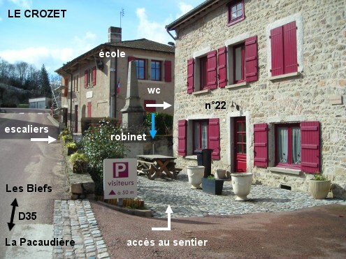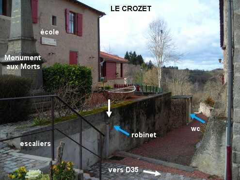 Ces toilettes se trouvent dans une allée piétonne qui débute vers le Monument aux Morts érigé au bord de la D35 à droite de l'école. Il y a aussi un robinet au début de ladite allée. Sur la D35 en provenance de La Pacaudière, surveiller le côté droit de la route, peu avant le Monument aux Morts et le bâtiment de l'école quitter la route et passer devant le bâtiment portant le numéro 22. On verra d'abord le robinet fixé sur le mur face à soi, au pied des escaliers descendant depuis la D35, et sur la droite dans l'axe des escaliers l'étroit sentier piéton (gravillonné) encaissé entre deux murs. Parcourir quelques mètres sur ce sentier pour trouver les toilettes côté gauche. N.B. : Le lavabo dans la cabine WC (porte de gauche) est relativement petit.