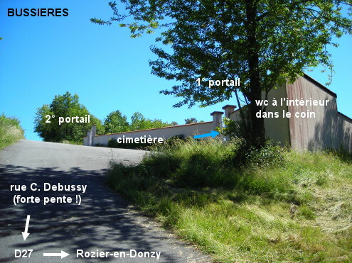 Ces toilettes se trouvent dans l'enceinte du nouveau cimetière situé au sommet d'une côte à la périphérie de la ville, à 165 mètres de la D27 direction Rozier-en-Donzy. 1) Sur la D27 en provenance de Rozier-en-Donzy, 130 mètres après le panneau de début de ville, tourner à droite entre deux maisons dans la rue étroite qui monte avec une forte pente (près de 15%!). Le cimetière est implanté au sommet, côté droit. Entrer par le portillon à droite du premier portail pour trouver à l'intérieur, soit les toilettes avec un lavabo dans le coin à droite, soit un robinet sur vasque à gauche du portail. 2) A partir du centre-ville, suivre la direction de Rozier-en-Donzy ou de l'aire de covoiturage, et après cette dernière implantée à gauche à côté de la caserne des Pompiers, tourner à gauche après l'abribus pour monter dans la rue Debussy jusqu'au nouveau cimetière.