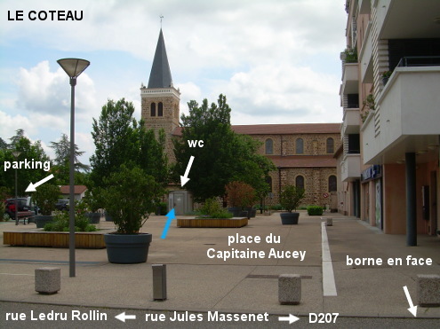 Ces toilettes se trouvent sur la grande place située à côté de l'église, non loin de la D207. Quant à la borne, elle se trouve à l'angle de la rue qui sépare en deux parties ladite place. Pour se rendre sur les lieux, suivre le fléchage du parking Aucey. 1) En provenance de Commelle-Vernay sur la Voie Verte (celle-ci longe d'abord le côté gauche de la D43 et débute au rond-point situé avant celui avec la D56), quand elle arrive vers le pont sur la Loire perpendiculairement à celui-ci, prendre à droite la bande cyclable et traverser aussitôt à gauche sur le marquage vert de la bande cyclable puis tourner à droite (rue Parmentier, qui est la branche gauche du carrefour en Y quand on arrive de Roanne par le pont). Peu après, tourner dans la première à droite en suivant la flèche ''P Aucey'' (rue Ledru Rollin). On aperçoit déjà le clocher de l'église. Au stop tout droit, on longe la première partie (avec parking) de la place Aucey implantée à droite. 1a) Au carrefour suivant, tourner à droite puis traverser sur le passage piéton pour entrer sur l'esplanade piétonne qui est entre le parking et les bâtiments qui longent la deuxième partie de la place. La cabine WC est en face à 40 mètres de la rue. N.B.1 : Appuyer sur le bouton à gauche de la porte pour la déverrouiller avant de la tirer. N.B.2 : Cette cabine WC à nettoyage automatique n'est ouverte que de 7h à 20h. 1b) Si au lieu de traverser sur le passage piéton, on reste à droite, on verra la borne Bayard à quelques mètres sur le trottoir droit, à l'angle de la rue Jules Massenet avec la place Aucey. N.B.3 : Il faut actionner longtemps la molette droite d'arrière en avant pour faire couler l'eau. N.B.4 : En hiver l'eau est coupée sur cette borne, mais reste disponible au lavabo des toilettes. 2) En provenance de Pradines sur la D27, aux deux ronds-points proches situés vers la Zone Industrielle continuer tout droit. Juste après le passage à niveau, tourner à droite dans la D207 en direction du centre-ville. Après le carrefour avec la D43 qui vient à gauche de Commelle-Vernay (et après l'accès à la gare SNCF), parcourir 720 mètres (attention à la succession de priorités à droite !) pour tourner dans la huitième à droite (rue Jules Massenet) en suivant la flèche du parking Aucey (il y a aussi une flèche ''écoles du centre'', l'école est en face au bout de la rue se terminant sur un carrefour en T). On trouvera la borne sur le trottoir côté gauche juste avant le début de la grande place avec parking, et si on traverse à droite sur le passage piéton on verra alors les toilettes en face à quelques mètres. P.S. : Si sur la D207 en apercevant l'église au bout d'une rue à droite et en voyant la flèche ''école Saint-Marc'' (du même nom que l'église), on a tourné dans la septième rue et non dans la huitième, il suffit ensuite de tourner à gauche après l'église. On aura alors sur la gauche la place avec le WC.