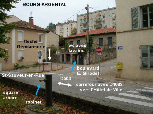 Ces toilettes et ce robinet se trouvent à proximité de la Gendarmerie (fléchée) qui est proche de la D503 direction Saint-Sauveur-en-Rue. Le robinet est au bord d'un square arboré implanté au bord de la D503. Quant aux toilettes, elles sont situées à 10 mètres de la D503, près de l'angle de deux rues qui est presque en face de la Gendarmerie. 1) En venant de Saint-Julien-Molin-Molette sur la D503, au stop avec la D1082 à très grande circulation (sur laquelle elle se superpose) tourner à droite (en direction du centre-ville), dépasser aussitôt le carrefour à gauche avec la D29 venant de Burdignes, puis au carrefour juste après l'Hôtel de Ville sis côté gauche tourner à gauche en direction de Saint-Sauveur-en-Rue dans la D503 (tronçon à très grande circulation). 1a) Plus loin, après l'église et le stop, après un premier passage piéton, en face d'un autre passage piéton, on verra côté gauche un square piéton arboré bordé d'un muret sur l'extérieur duquel il y a face à ce passage piéton, un écriteau vert ''eau potable'' au niveau d'un support à section carrée sur lequel est fixé un robinet à l'intérieur du square. Continuer sur quelques mètres pour trouver l'entrée du square à la fin de celui-ci vers un troisième passage piéton (deux marches d'escaliers puis une dizaine de mètres sur l'herbe à parcourir jusqu'au robinet). 1b) Côté droit, derrière le carrefour avec une rue adjacente, on verra deux petites flèches dont celle de la Gendarmerie, en regard du milieu du square précité. Une fois que l'on a tourné à droite dans ce boulevard Émile Girodet (dont la suite est en sens interdit) on verra la Gendarmerie côté droit derrière une rue adjacente en impasse et les toilettes côté gauche au début d'une autre rue adjacente (rue Melon).