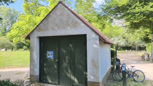 Borne située dans le parc du Poutyl à Olivet, contre un mur de WC publics. L'endroit se trouve près l'entrée du parc située rue Paul Genain (la deuxième, la plus au sud).