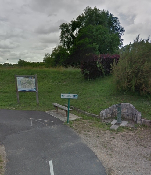 Borne située à l'intersection de la D60 avec la petite piste cyclable qui descend de la levée à l'entrée de Saint-Benoît. La borne est sur l'itinéraire de la Loire à vélo, un banc et des panneaux se trouvent juste à côté.