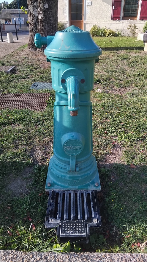Borne à eau située sur la place en face de l'église (vers la ruelle à gauche du bâtiment), à proximité d'un arbre et d'un banc