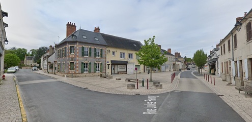 Borne située sur la place de la République, à l'intersection des rues Gambetta (D10) et Jules Ferry. Des bancs en pierre se trouvent à côté.
