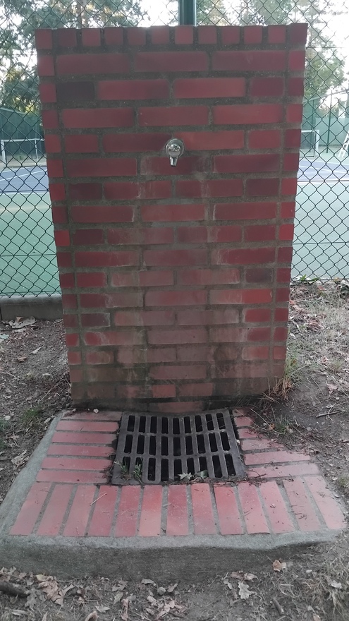 Robinet se trouvant contre un petit mur en brique, devant les terrains de tennis du parc de Morchêne (qui sont situés au nord du parc)