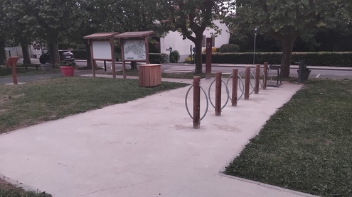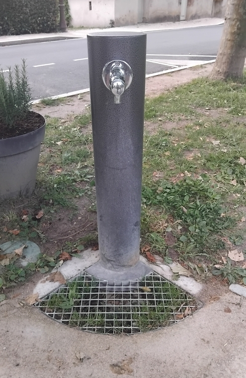 Robinet situé sur une aire de repos au bord du canal, au niveau de l'écluse de Vitry-aux-Loges. Le robinet se trouve près de la route et d'appuis vélo.