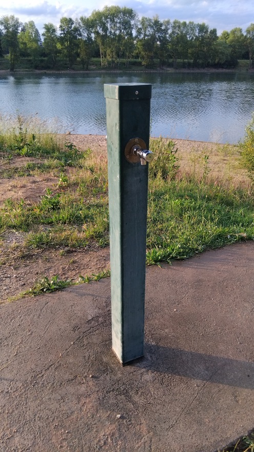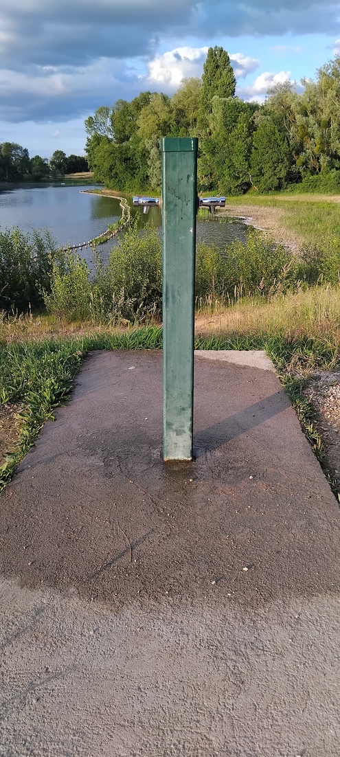 Double robinet situé le long du chemin longeant le plan d'eau principal de l'Île Charlemagne (commune de Saint-Jean-le-Blanc), sur la rive sud de celui-ci et à l'est de la base de loisirs.