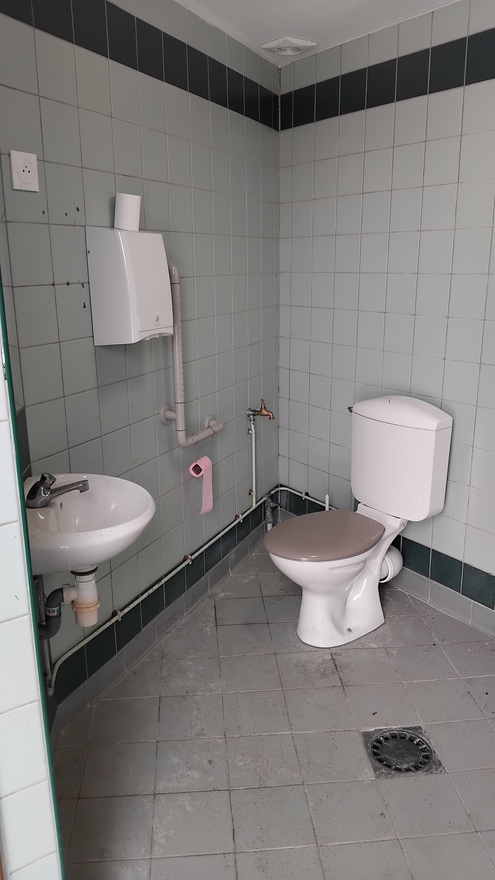 Toilettes publiques situées dans un petit bâtiment en brique le long de la route de Gien (D951), à côté d'un arrêt de bus. Le bâtiment comporte aussi une cabine à livres (partie visible depuis la route) et un abri avec un banc.