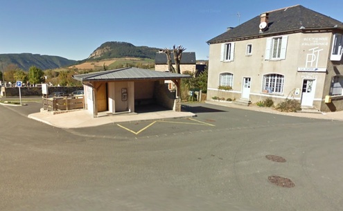Toilettes publiques avec robinet d'eau potable sous le bâtiment qui abrite aussi l'arrêt de bus
