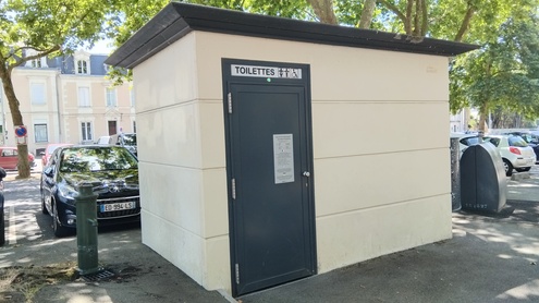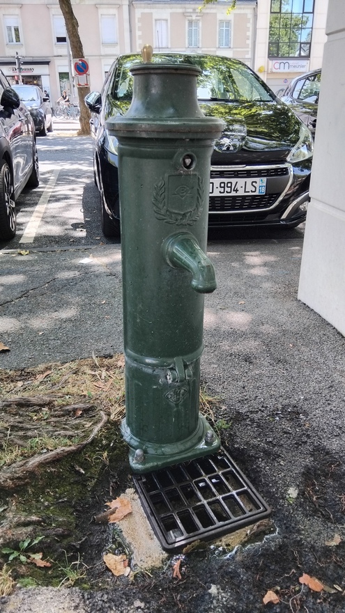 Borne située sur le trottoir entre la route et le Parking Place Bichon 2. Elle se trouve entre un arbre et des toilettes publiques (pouvant aussi servir de point d'eau).