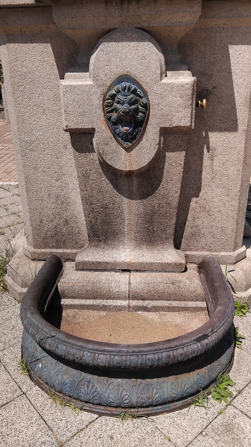Fontaine située à l'ouest de la place, au centre de la partie sans arbres. L'eau sort de la bouche du mascaron qui représente une tête de lion se trouvant sur le façade sud de la fontaine. Pour la faire couler il faut appuyer sur le bouton se trouvant à droite de ce mascaron.