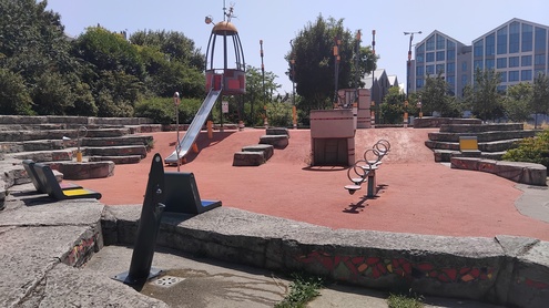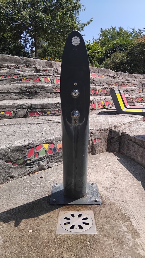 Robinet se trouvant dans le Jardin Eblé, à côté d'une aire de jeux pour enfants et au pied de gradins en pierre