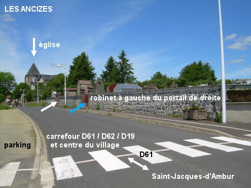 L'ancien cimetière est situé au bord de la D61 direction Saint-Jacques-d'Ambur. Les deux robinets sont à l'intérieur à gauche du portail de droite. 1) En provenance de Saint-Jacques-d'Ambur sur la D61, le cimetière est implanté côté droit. Entrer par le premier portail (celui de droite) pour trouver deux robinets sous le petit abri immédiatement à gauche : un robinet-poussoir au-dessus d'un mini évier, et un robinet-vanne à sa gauche un peu plus bas. 2) En provenance de Saint-Priest-des-Champs sur la D62, à l'intersection avec la D19, prendre en face la D61 direction Saint-Jacques-d'Ambur. Le cimetière est implanté côté gauche un moment après l'église, et son portail de droite est à 210 mètres du carrefour.