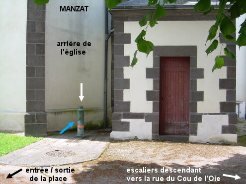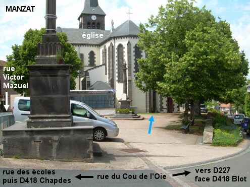 La borne Bayard est implantée contre l'arrière de l'église dans le centre du village. 1) Sur la D418 en provenance de Chapdes, continuer tout droit en direction du ''centre bourg'' (rue des écoles), on arrive alors à un carrefour où l'on voit l'église vers la gauche. Entrer sur la place et se diriger vers l'église, la borne est vers la partie droite. 2) Sur la D227 en provenance de Châteauneuf-les-Bains, vers le centre du village, en face du carrefour à gauche avec la D418 (direction Blot-l'Eglise), tourner à droite en suivant la flèche ''Mairie'' (rue Victor Mazuel à droite, ou rue du Cou de l'Oie en face). Continuer au-delà de l'église pour entrer sur la partie de la place qui est derrière l'église et trouver la borne.