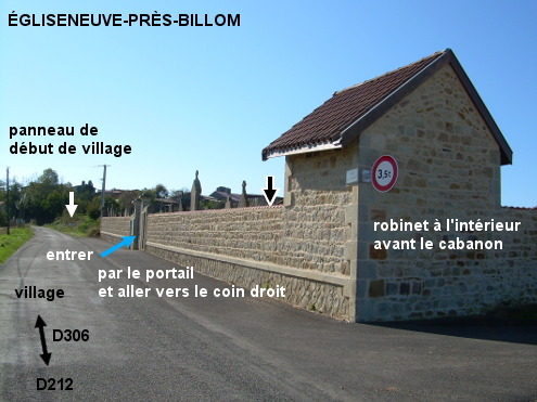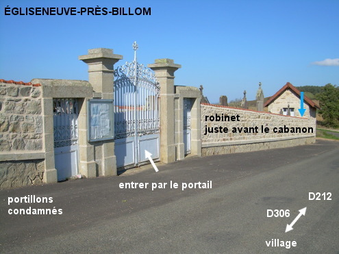 Le cimetière est situé un peu en dehors du village sur la D306 quand on roule en direction de Glaine-Montaigut. Le robinet est à l'intérieur du cimetière, juste avant le cabanon en pierre construit dans le coin avant droit. 1) En provenance de Reignat sur la D81 puis un bout de D212 (direction Thiers) et enfin la D306, au niveau du point kilométrique 4 on sera en face du portail du cimetière implanté côté droit. Entrer par le portail (les deux portillons étant condamnés) et se diriger vers la droite (25 mètres d'allée engazonnée) pour trouver le robinet fixé sur le mur juste avant le cabanon en pierre qui est dans le coin. 2) En provenance de Bongheat sur la D303, au carrefour en T tourner à droite (en sens opposé au lieu-dit la Jonchère sur l'autre partie de la D306), elle se superpose un moment à la D306. Plus loin, après le centre du village et vers un lavoir (attention : son eau est non potable), tourner à droite (la plus à droite) en direction de Glaine-Montaigut, dans la D306. Le cimetière est implanté côté gauche et son portail est situé 65 mètres après le panneau de fin de village.