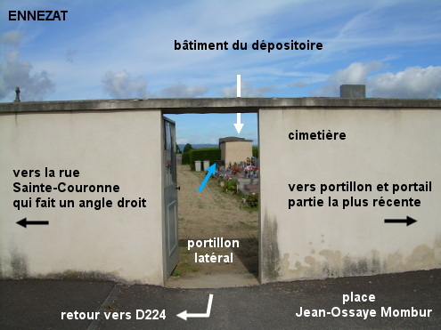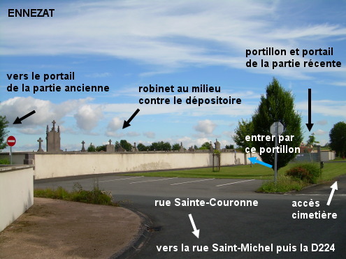 Le cimetière est implanté dans une rue secondaire située à la périphérie nord-ouest de la ville, à 190 mètres de la D224. Il comporte plusieurs entrées mais un seul point d'eau disponible, qui se trouve contre le grand bâtiment du dépositoire situé grosso-modo au milieu. 1) À partir du centre-ville de Riom, prendre la direction d'Ennezat mais vers la sortie de la ville au rond-point juste derrière le pont sur la voie ferrée quitter la D224 à grande circulation pour tourner à gauche en suivant la flèche ''le Moulin d'Eau'' : il s'agit de la D83, petite route tranquille qui rejoint la D224 à l'entrée d'Ennezat. À la la fin de la D83 tourner à gauche, puis après un premier carrefour à gauche en patte d'oie, deux options sont possibles. 1a) Tourner dans la suivante à gauche juste avant la statue claire d'un archange en direction du cimetière, et 150 mètres après tourner à droite devant le cimetière (rue Sainte-Couronne). Si l'on entre par le premier portail, avancer sur l'allée en sable tassé jusqu'aux groupes de haies arbustives dont celles de droite jouxtent l'avant du dépositoire (40 mètres). Puis faire deux pas sur la droite avant le bâtiment pour trouver le robinet dans le coin entre la haie et le bâtiment. P.S. : Si l'on continue dans cette rue en sens unique, on débouche à droite de la place Jean-Ossaye Mombur sur laquelle donnent les autres entrées du cimetière. 1b) Tourner dans la rue Saint-Michel, entre l'archange et la croix, en sens interdit sauf pour les vélos, puis au carrefour en Y prendre la branche gauche (rue Sainte-Couronne) pour déboucher sur la place Jean-Ossaye Mombur avec le cimetière sur sa gauche. Ignorer le portail et le portillon qui le jouxte (le point d'eau à l'intérieur à gauche était indisponible, en juillet 2024), que l'on voit plus loin en face (partie récente du cimetière), mais entrer par le portillon isolé au milieu du mur à gauche de la place. Avancer de 40 mètres jusqu'au dépositoire pour trouver le robinet sur le côté gauche dans le coin avec la haie. 2) En provenance d'Entraigues sur la D224, longtemps après l'intersection avec la D210G, et après l'église érigée côté droit, tourner à droite dans la rue à l'angle de laquelle il y a une croix et avant celle avec la statue de l'archange, puis idem 1b jusqu'au portillon latéral de l'ancien cimetière (à 240 mètres).