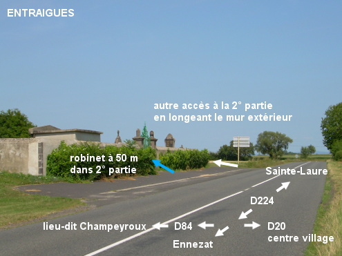 Le cimetière est situé en dehors du village, sur la D224 direction Sainte-Laure, à 130 mètres du carrefour avec la D84 et avec la D20 qui traverse le village. Le robinet se trouve dans la deuxième partie du cimetière située derrière la première partie. 1) Sur la D20 en provenance de Joze, traverser tout le village en direction d'Ennezat, puis au carrefour avec la D224, tourner à droite direction Sainte-Laure. Le cimetière est implanté côté gauche un peu plus loin. Deux options sont alors possibles pour accéder au robinet. 1a) Entrer par le portail (N.B. : il sera difficile de ré-enfiler le loquet dans la gâche) et avancer de 50 mètres sur l'allée gravillonnée jusqu'au passage dans le mur de séparation des deux parties, pour trouver le robinet au dos du mur côté droit. 1b) Longer par l'extérieur le mur de droite du cimetière (l'herbe était bien tondue en août 2024) jusqu'au passage ouvert dans le mur d'enceinte qui donne dans la deuxième partie. Entrer et avancer jusqu'au robinet à gauche au bout du premier pan de mur de séparation. 2) En provenance des Martres-sur-Morge sur la D84 (attention : la signalisation est insuffisante ! vers l'église des Martres au carrefour en T il faut faire gauche / droite pour prendre la rue des écoles, puis à l'entrée du lieu-dit Champeyroux prendre à droite la ''rue de la fontaine'' pour rester sur la D84), au carrefour avec la D20 qui entre dans le village en face et avec la D224, tourner à gauche dans la D224 direction Sainte-Laure pour trouver le cimetière 130 mètres plus loin côté gauche.