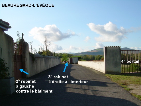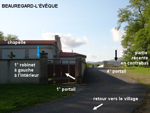 Le cimetière est situé en dehors du village au bout d'une route en cul-de-sac, à 1,66 km de la D4. En provenance de Culhat sur la D4, longtemps après le début du village, tourner à droite juste avant le terrain de football bordé d'arbres, en suivant la petite flèche verte ''cimetière'' (place du Coudert). Longer ainsi le terrain de football puis au carrefour en T tourner à droite et aussitôt à gauche en suivant la flèche ''cimetière à 2 km'' (plus proche en réalité, c'est un arrondi). Rouler ensuite tout droit pendant un moment, après une partie plate ça descend (il faudra remonter la pente au retour !) puis c'est de nouveau plat. N.B.1 : Vers le petit pont sur la rivière la chaussée n'est pas en très bon état et il faut anticiper la grimpette à venir. Juste après ce pont, tourner à droite (la première est un chemin de terre, comme la suite en face) et grimper jusqu'au cimetière. Celui-ci est implanté sur un replat au sommet côté gauche et en face. 1a) Si l'on entre par le premier portail, on trouvera le premier robinet tout de suite à gauche. 1b) Dans le cas où ce robinet ne serait pas en service, si l'on entre alors par le deuxième portail (à 50 mètres du premier, et au-delà du portillon et de la chapelle) on trouvera le deuxième robinet immédiatement à gauche contre le bâtiment jouxtant la chapelle. 1c) Et si l'on poursuit jusqu'au troisième portail (à 40 mètres du deuxième) situé en face et tout au bout de l'impasse, on trouvera le troisième robinet à l'intérieur tout de suite à droite contre la haie arbustive. N.B.2 : Le quatrième portail qui est en avant et à droite du troisième portail, donne dans la partie la plus récente en contrebas, et il n'y a pas de robinet juste à côté de ce dernier.