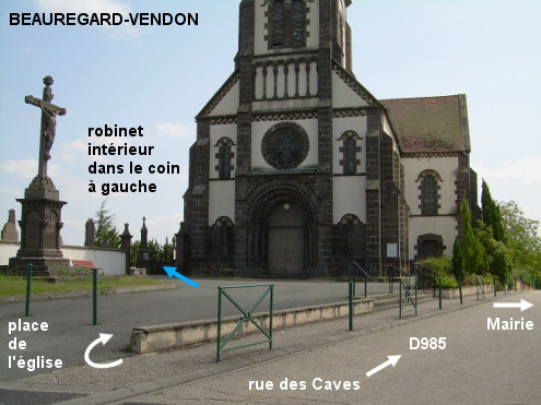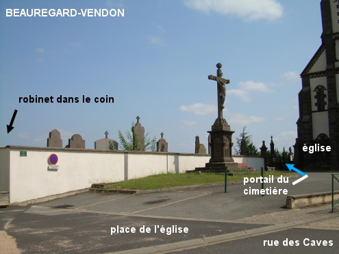 Le cimetière est implanté à côté de l'église, non loin de la Mairie (et de la maison des associations, fléchée). 1) Sur la D985 en provenance de Saint-Myon, tourner à droite (rue des Caves) en suivant la flèche ''maison des associations'' et continuer tout droit jusqu'à l'église érigée côté droit (à 280 mètres) dont on voit d'abord l'arrière. Virer en épingle à droite après l'église pour entrer sur le parvis piéton qui est devant l'entrée de l'église. Entrer dans le cimetière par le portail qui est à gauche de la porte de l'église (il fallait en effet ignorer l'autre portail du cimetière situé avant l'église et en retrait, parce qu'il n'y a pas de robinet dans cette partie-là). Une fois à l'intérieur, virer à 180° à gauche et aller jusque dans le coin avant gauche du cimetière pour trouver le robinet (30 mètres d'allée asphaltée). 2) En provenance du lieu-dit Rouzat sur la D403 (qui est rejointe par la D15 venant à droite de Gimeaux), à l'intersection juste avant le village avec la D2144 (route à très grande circulation) prendre la rue presque en face (chemin des Roches) puis ignorer les deux rues à droite. Continuer tout droit et après avoir dépassé la maison des associations et la Mairie sises côté droit, on sera au carrefour en T face au côté de l'église. Tourner à gauche puis entrer aussitôt à droite sur le parvis de l'église, et se diriger vers le portail du cimetière à gauche de l'entrée de l'église. P.S. : En continuant sur quelques mètres (en tournant le dos au cimetière), on aura à droite une rue menant au lieu-dit Chaptes où on arrivera en T sur la D122 (direction La Moutade à droite, puis à l'intersection avec la D985 faire gauche / droite pour la suite de la D122).