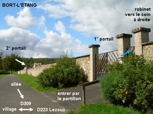 Le cimetière est situé en dehors du village, près de la D309 quand on roule en direction de Lezoux. 1) À partir du centre du village, prendre la direction de Lezoux sur la D309. Juste après le panneau de fin de village et le petit pont sur la rivière, tourner à gauche dans l'allée asphaltée qui dessert le cimetière qui est implanté côté droit un peu plus loin. Entrer par le portillon qui est à côté du premier portail (à 40 mètres de la D309) et se diriger vers la droite jusqu'au mur latéral pour trouver le robinet (environ 12 mètres d'allée en herbe). N.B. : Il n'y a pas de robinet près du deuxième portail. 2) En provenance de Lezoux sur la D223 (direction Courpière) puis la D309, surveiller le côté droit de la route : juste après les deux parkings séparés par une haie arbustive et juste avant le panneau ''zone 30'' (avant le pont et le début du village), tourner à droite dans l'allée qui dessert le cimetière que l'on ne voyait pas depuis la route. Entrer par le portillon à côté du premier portail pour trouver le robinet vers le coin avant droit du cimetière.
