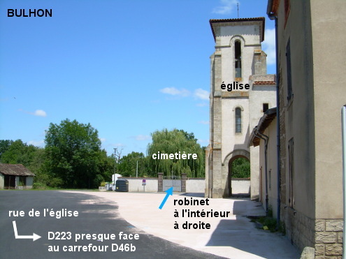 Le cimetière est implanté contre l'église dans une rue secondaire, à 130 mètres de la D223 près de son carrefour avec la D46b qui conduit au lieu-dit La Croix-Mauzat. 1) En provenance de Lezoux sur la D223, longtemps après le début du village, après la Mairie sise côté droit, et juste après le carrefour à droite avec la D46b, tourner à gauche devant le Monument aux Morts qui est derrière la rue adjacente à gauche. Ensuite, attention : ne pas continuer tout droit dans l'impasse mais suivre la courbe à droite pour arriver devant le portail du cimetière situé à gauche de l'église. Entrer dans le cimetière et faire trois pas sur la droite jusqu'au robinet. 2) En provenance de Crevant-Lavéine sur la D223, peu après le panneau de début de village, tourner à droite vers le Monument aux Morts qui est dans l'angle. Puis suivre la courbe à droite que fait cette rue jusqu'au cimetière implanté côté droit.
