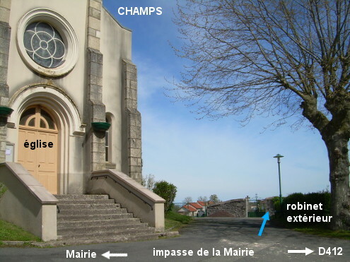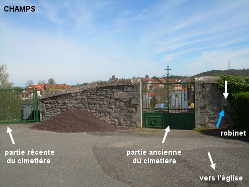 Le cimetière est implanté au fond d'une impasse à côté de l'église, à 100 mètres de la D412. En provenance de Saint-Agoulin sur la D12, juste près le panneau de début de village tourner à droite sur la D412 en direction du centre du village. Un peu plus loin tourner à gauche en direction de la Mairie et de l'église (que l'on voit déjà) sur une placette au bord de laquelle il y a une croix. Arrivé devant l'église, suivre la flèche indiquant un parking sur la droite (c'est celui du cimetière), pour arriver (25 mètres après) devant le portail de la partie la plus ancienne du cimetière. Le robinet est à l'extérieur, à droite de ce portail de droite près de la haie arbustive.