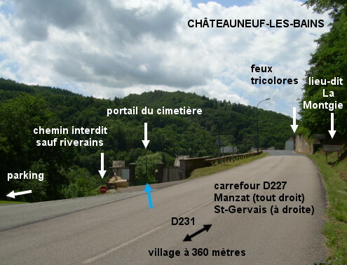 Le cimetière est situé en dehors du village, il est implanté côté gauche sur la D231 quand on roule en direction de Saint-Gervais-d'Auvergne ou de Manzat par la D227, au début du lieu-dit La Montgie. Il est situé après un grand parking en terre battue, 360 mètres après le panneau de fin de village, dans la fourche formée par la D231 et le ''chemin de la Rose'' réservé aux riverains. Entrer par le portail qui nous fait face un peu en contrebas de la route, pour trouver le robinet sur sa droite. Ce portail est situé 110 mètres avant les feux tricolores protégeant le carrefour avec la D227 (tout droit : direction Manzat, en épingle à droite : direction Saint-Gervais-d'Auvergne).