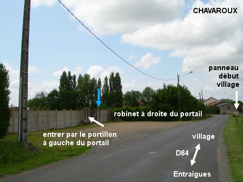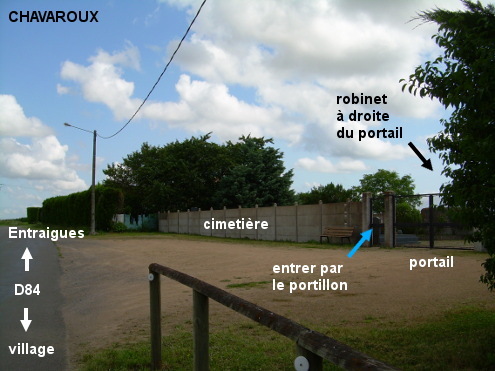 Le cimetière est situé en dehors du village sur la D84 direction Entraigues. 1) Sur la D84 en provenance d'Entraigues, le cimetière est implanté côté gauche en retrait de 15 mètres par rapport à la route. Entrer par le portillon et faire quelques pas sur la droite pour trouver le robinet à droite du portail lui-même à droite du portillon. 2) En provenance de Lussat sur la D54 puis la D84, au rond-point avec la D51, tourner à gauche (dernière sortie) en direction d'Entraigues dans la D51 qui se superpose à la D84 sur quelques centaines de mètres puis part à gauche (direction Chappes) devant l'église, tandis que la D84 continue tout droit en direction d'Entraigues. Continuer sur la D84 et 55 mètres après le panneau de fin de village, à la fin de la barrière en bois qui longe la route, entrer à droite sur l'espace en terre battue devant le cimetière.