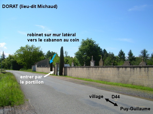 Le cimetière est situé sur le territoire du lieu-dit Michaud qui jouxte la commune de Dorat à laquelle il est rattaché. Il est implanté côté droit sur la D44 en provenance de Puy-Guillaume, 250 mètres après le panneau marquant le début du lieu-dit et 140 mètres avant le panneau de fin du lieu-dit et de début du village de Dorat. Entrer par le portillon à gauche du portail et se diriger vers le coin avant gauche (25 mètres sur l'allée gravillonnée) pour trouver alors le robinet à droite du cabanon qui est dans le coin, et au début du mur latéral de gauche de l'enceinte du cimetière.