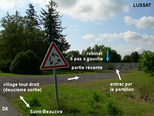 Le cimetière est situé en dehors du village, à côté du rond-point à l'intersection de la D6 direction Saint-Beauzire et de la D54 direction Malintrat. Il est en grande partie caché par la végétation, il comporte deux parties et deux robinets. 1) À partir du village sur la D6 direction Saint-Beauzire, au rond-point juste après le panneau de fin de village, la première sortie est la D54 direction Les Martres-d'Artière, la deuxième sortie la D6 direction Saint-Beauzire, la troisième sortie la D54 direction Malintrat. Entre la deuxième et la troisième sortie, un sentier (de 35 mètres) bordé de haies et d'arbres de chaque côté conduit au premier portail du cimetière qui est caché par toute la végétation. Entrer par le portillon à droite du portail pour trouver le premier robinet à l'intérieur à gauche, entre le portillon et le portail. 2a) Sur la D6 en provenance de Saint-Beauzire, juste après le panneau triangulaire annonçant le rond-point, entrer à droite sur l'allée très caillouteuse (35 mètres) qui conduit au portail de la partie la plus récente du cimetière, qui est à découvert. Entrer par le portillon, inclus dans la partie gauche du portail, puis faire six pas sur la gauche pour trouver le deuxième robinet fixé sur le mur. 2b) Ou bien, continuer quelques mètres sur la D6 pour entrer à droite sur le parking en terre battue à son début. Puis se diriger vers le passage dans la haie arbustive (30 mètres à parcourir) pour déboucher sur le sentier qui part du rond-point et mène au premier portail du cimetière, juste à côté du portillon (sur la droite).