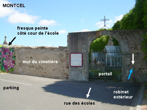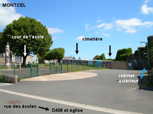 Le cimetière est situé dans une rue secondaire à côté de l'école, non loin de l'église, et à 90 mètres de la D408 direction Charbonnières-les-Vieilles. Le robinet est à l'extérieur, à droite du portail. 1) En provenance de Charbonnières-les-Vieilles sur la D408, au niveau de l'église érigée côté droit, tourner à gauche puis 50 mètres après entrer à droite sur le parking devant l'école (on repère bien la fresque peinte sur le mur du fond mitoyen avec le cimetière). Avancer de 40 mètres jusqu'au portail du cimetière : le robinet est à l'extérieur à droite. 2) En provenance de Blot-l'Église sur la D122, peu après le panneau de début de village, on aperçoit l'arrière du cimetière en surplomb côté droit, mais il n'y a pas de robinet près du portail arrière. Il faut continuer sur la D122 jusqu'à l'intersection avec la D408 et tourner à droite dans la D408 en direction de Charbonnières-les-Vieilles, puis 40 mètres après tourner à droite en direction du cimetière. Entrer ensuite à droite sur le parking devant l'école pour trouver au fond de celui-ci le robinet à droite du portail du cimetière.