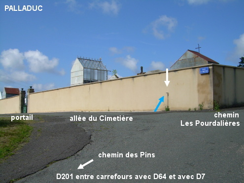 Le cimetière est fléché à partir de la D201 entre les carrefours très proches l'un de l'autre avec la D64 et avec la D7. Le robinet est à l'extérieur, à droite du portail près de l'extrémité du mur. 1) En provenance d'Arconsat sur la D64, juste après le carrefour à droite avec la D201 venant du lieu-dit Pitelet (et juste avant le carrefour à gauche avec la D7 en direction du lieu-dit Le Pont-de-Celles), tourner à droite (chemin des Pins) en direction du cimetière (la flèche est orienté pour ceux qui roulent en sens inverse). Monter pendant 200 mètres (pente proche de 10%) jusqu'à la rue adjacente à gauche derrière laquelle est implanté le cimetière sur un replat. Le robinet est vers le coin. 2) En provenance de Saint-Rémy-sur-Durolle sur la D201, au niveau de l'église érigée côté droit et du passage piéton, tourner en épingle à gauche dans la voie étroite qui monte (à côté des flèches pour le lieu-dit Les Bourniers, orientées pour le sens inverse) puis tourner aussitôt à droite dans l'allée du Cimetière (pente supérieure à 10%). Le cimetière est implanté côté gauche au sommet. Continuer au-delà du portail pour trouver le robinet vers l'extrémité du mur (à 170 mètres de la D201).